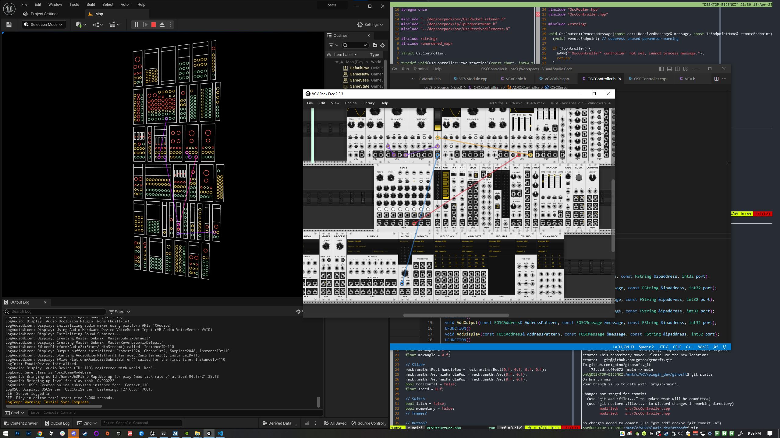 I have decided, initially at least, to use Open Sound Control (OSC) for communication between Rack and Unreal. OSC is a “data transport specification…for realtime message communication among applications and hardware.” There are a few reasons for this choice: OSC was designed for real-time communication and is very flexible about how messages are structured. Unreal has a built-in library for handling OSC communication and there is a straightforward library for C++ too. And lastly, I have seen other VCV Rack modules using it so I know it’s feasible to work it into the system.