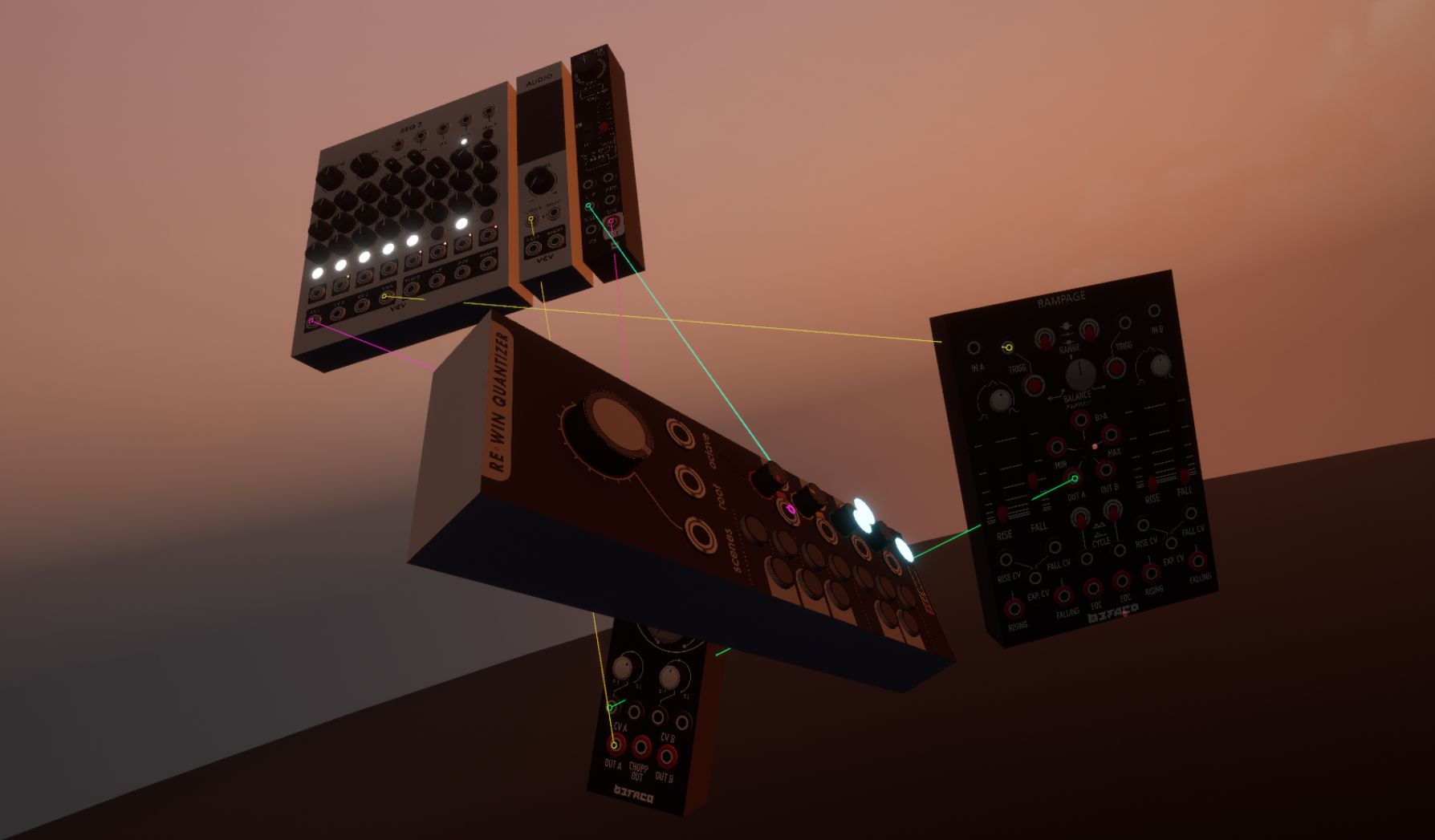 Finally, I decide to throw in (ie spend another entire week working on) a tooltip widget that follows each hand and shows the same information the mouse tooltip does in Rack. This helps a lot with fine-tuning any knobs or sliders, and, along with a little haptic bump, provides additional feedback to the user as to when they’re interacting and with which port or param.