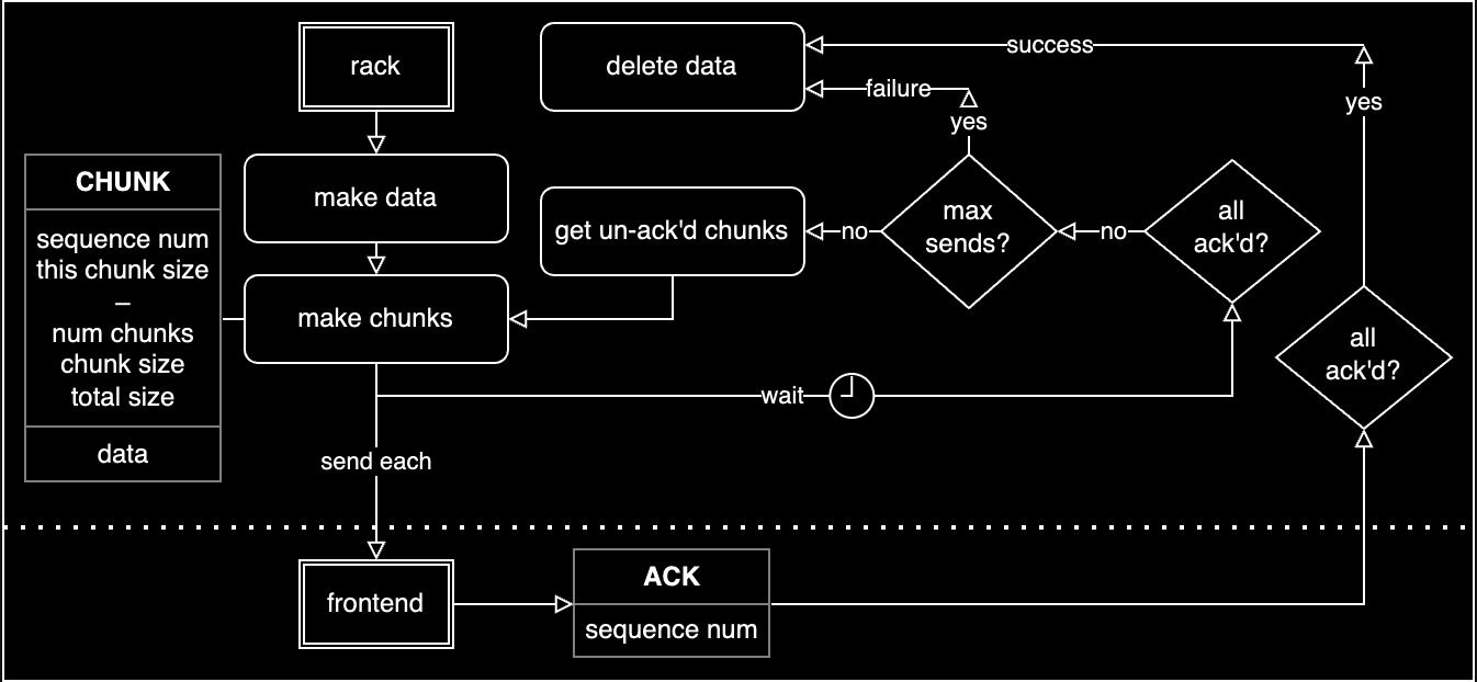 We chunk up the data, sending each chunk over to the front end. Each packet contains its chunk of data, plus all of the metadata necessary to reconstruct the data. Upon receipt, the front end sends back an ACK (acknowledge) message with the sequence number of the chunk it just received. When Rack receives an ACK, it checks to see whether all chunks have been received, and proceeeds to the success state if so. After the initial send, Rack also sets up a delayed action to check for un-ACK’d chunks and resend them. If any chunk has been sent more than a configurable number of times, it is considered failed and the entire process proceeds to the failed state. In the diagram, a failure and a success are treated the same way: dispose of the data and move on. In reality, we might want to retry from the beginning, notify the user, and/or tell the front end to discard the partial data.